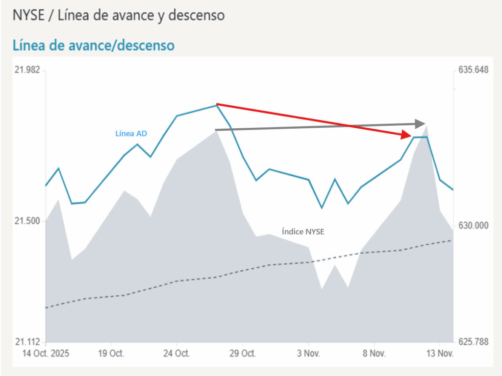 El mercado necesita un descanso o limpieza y se están acumulando factores técnicos para que dicha situación se produzca próximamente. Uno de ellos, es que se ha vuelto a activar la divergencia bajista de la Línea AD vs. el índice NYSE y eso por sí solo nos podemos en modo “alerta”.